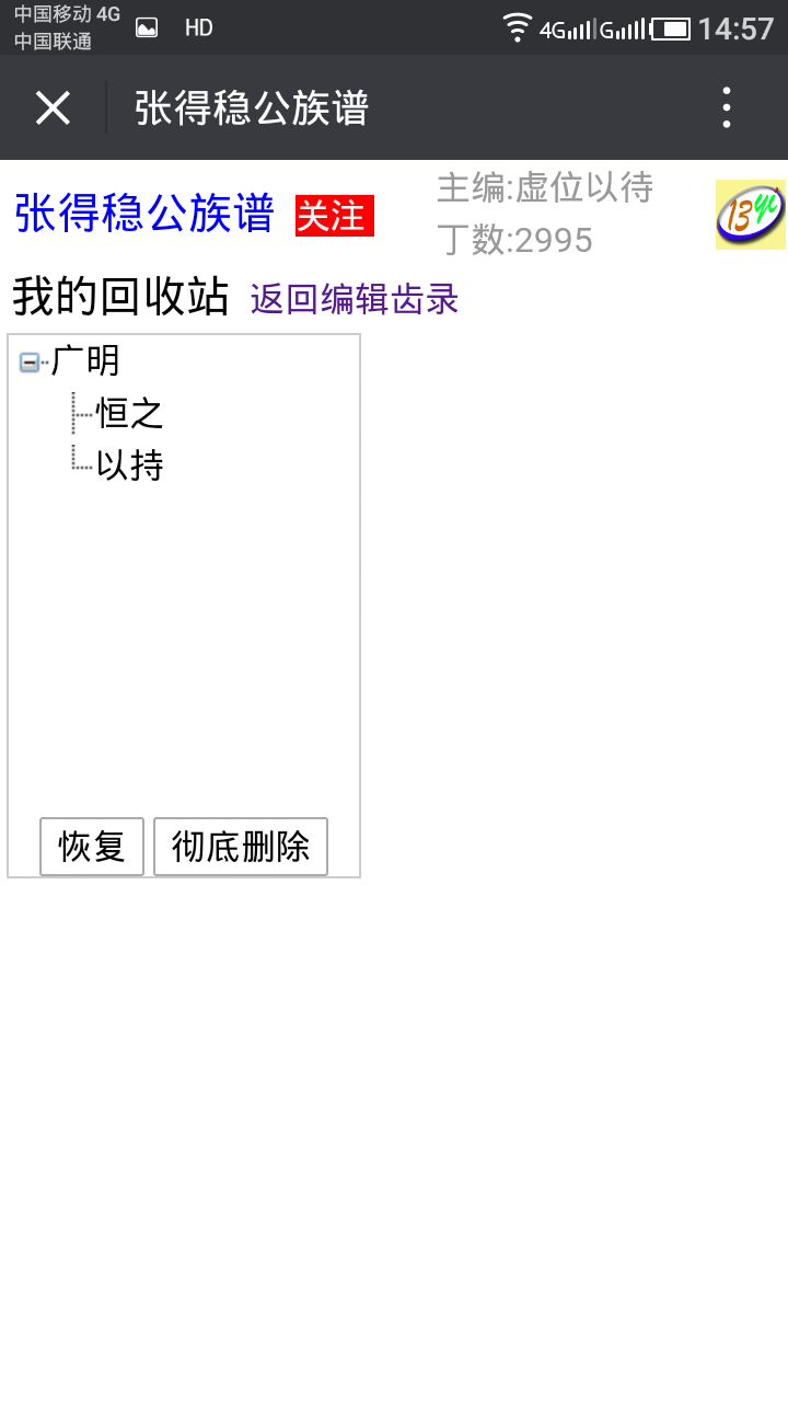 世系(名字)一旦被删除。首先会放在回收站。有权限的成员可进入回收站,将世系恢复或者彻底删除: